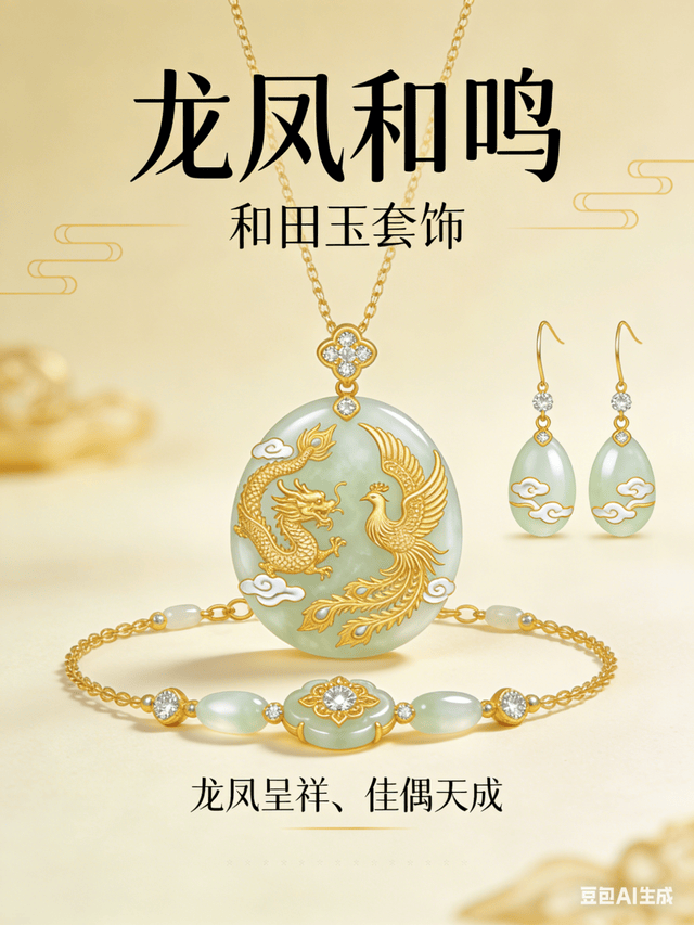 “龙凤和鸣” 和田玉套饰是该系列的代表作之一,包含吊坠、耳坠与手链三件套。设计上,采用浮雕与镶嵌结合的工艺,将龙凤图腾刻画得栩栩如生:龙的刚劲有力与凤的温婉柔美相互映衬,辅以祥云纹点缀,寓意 “龙凤呈祥、佳偶天成”。材质上,选用优质和田玉、黄金与小颗粒钻石搭配,和田玉的温润与钻石的璀璨相得益彰,既适合婚礼佩戴,也可作为传家之物。
