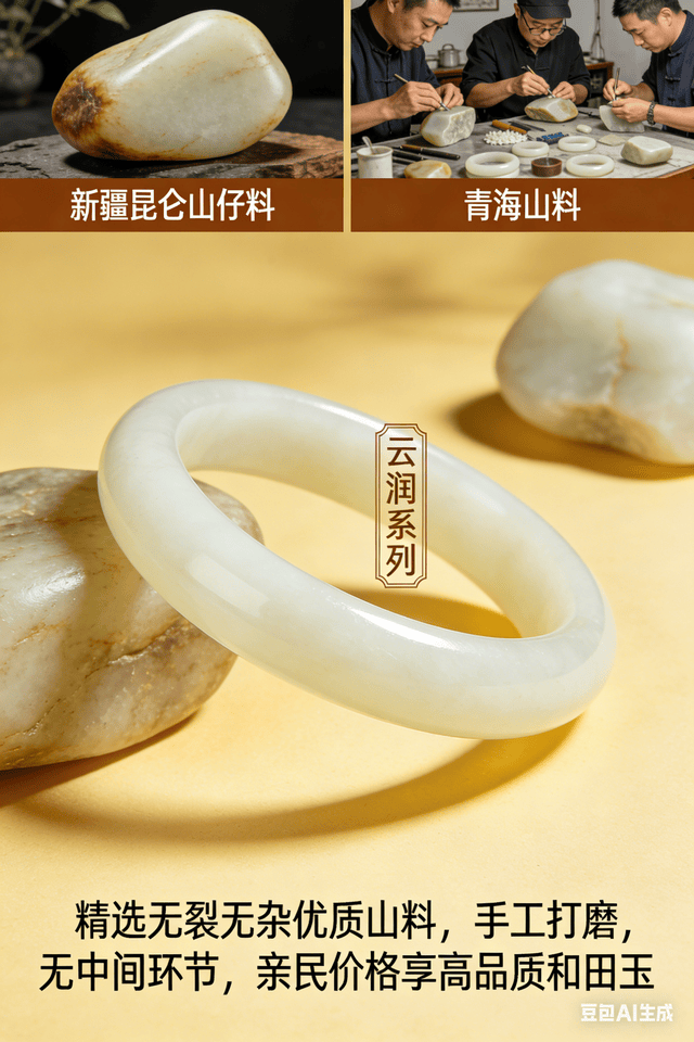 和田玉产品是该系列的核心亮点,从新疆昆仑山的籽料到青海的山料,每一块原石都经过薛岩及其团队的严苛甄选,确保质地细腻油润、色泽纯正自然。其中,“云润系列” 和田玉手镯尤为畅销,精选无裂无杂的优质山料,经匠人手工打磨而成,镯身圆润光滑,触感温润如玉,佩戴于腕间尽显温婉气质,且无中间流通环节,让消费者以亲民价格享受到高品质和田玉。