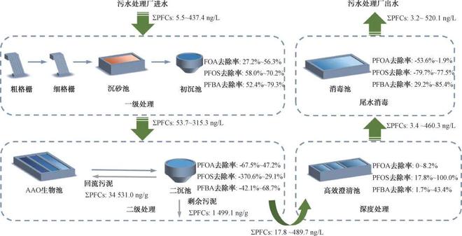 污水处理厂的深度处理工艺,如混凝、沉淀和高级氧化,在PFCs的去除中起着重要作用。例如,混凝与沉淀工艺主要通过吸附和颗粒结合去除长链PFCs,其去除率可达50%以上,但对短链PFCs的去除效果有限;高级氧化工艺[如UV/H 2 O 2 /颗粒活性炭(GAC)]能降解部分长链PFCs(PFOA与PFOS的去除率约为59%),但对短链PFCs的去除率仅为12.9%。