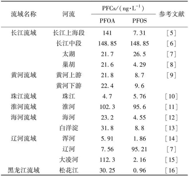 PFCs在水环境中易流动、极难降解且具有生物累积性,因此,广泛分布于水环境的多种介质中,包括水相、沉积物相和生物相。在水相中,短链PFCs因较高的水溶性,主要存在于地表水和地下水中,而长链PFCs则更倾向富集于沉积物和生物体内。PFCs可通过地表径流、地下渗透及大气沉降在环境中迁移。另外,其前体物(如氟调聚物磺酸盐)可通过水解、脱氟或生物降解等转化途径生成短链PFCs,从而增加短链PFCs的浓度。PFCs性质稳定,不易被生物降解或通过传统处理技术去除,在去除PFCs方面给污水处理厂带来了巨大挑战。常规污水处理工艺对短链PFCs的去除效率有限,且污水处理过程中可能因前体物降解进一步释放PFCs,导致出水中PFCs浓度增加。因此,明确PFCs在水环境中的赋存状态和迁移转化机制,有助于控制PFCs的污染。我国主要河流水系水体中PFOS和PFOA的平均浓度如表1所示。